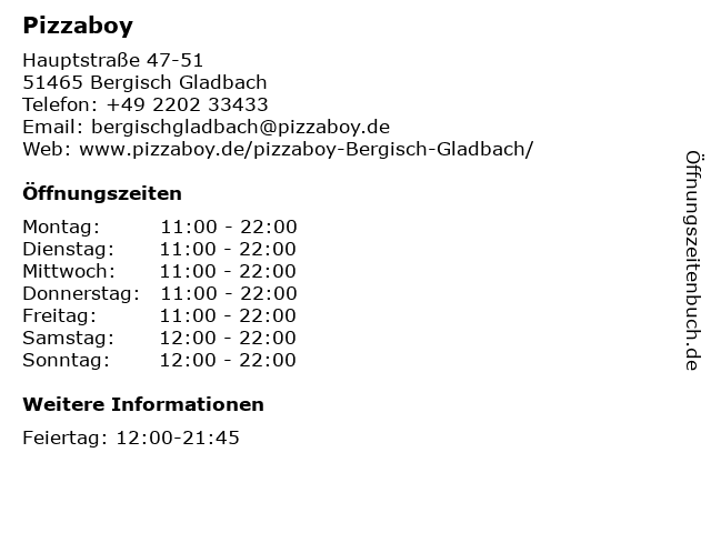 Öffnungszeiten Pizzaboy in Bergisch Gladbach anzeigen | |