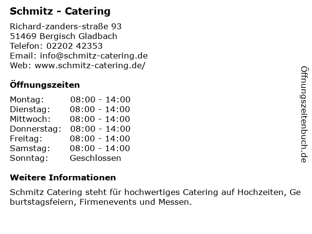 | Öffnungszeiten Schmitz - Catering in Bergisch Gladbach anzeigen | |