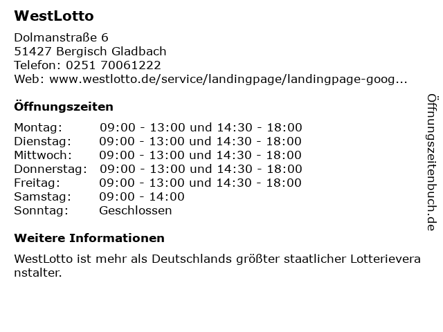 | Öffnungszeiten WestLotto in Bergisch Gladbach anzeigen | |