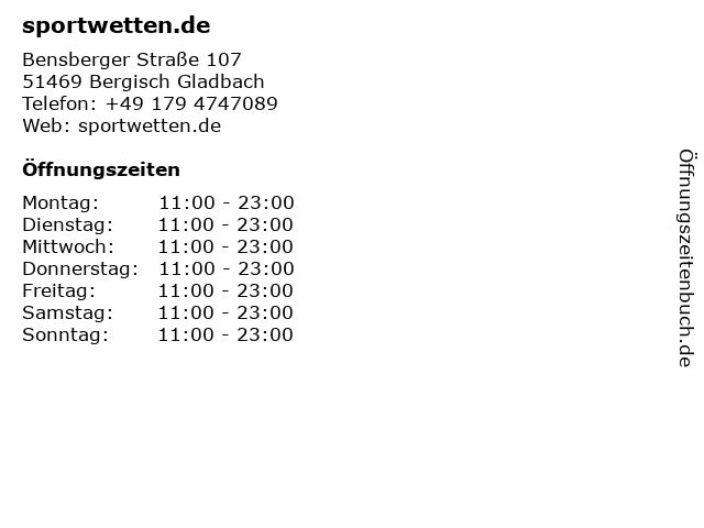 | Öffnungszeiten sportwetten.de in Bergisch Gladbach anzeigen | |