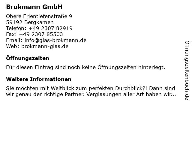 | Öffnungszeiten Brokmann GmbH in Bergkamen anzeigen | |