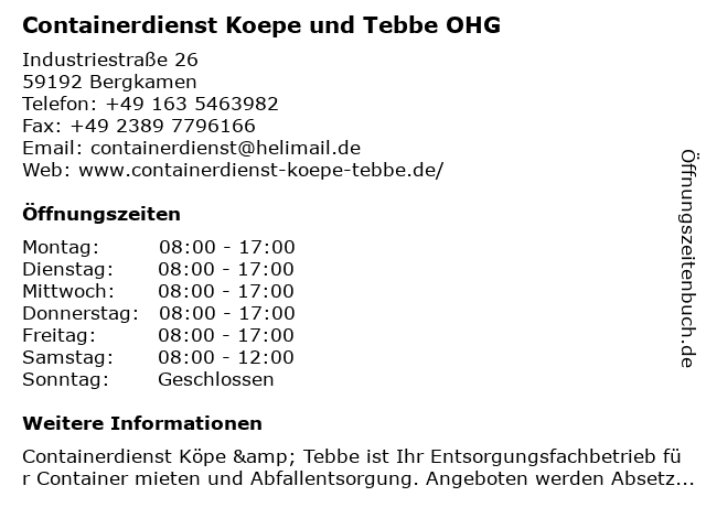 Branchen & Suchbegriffe zu Containerdienst Koepe und Tebbe OHG:abfallentsorgung, abrollcontainer, absetzcontainer, altholz entsorgen, baumischabfall, bauschutt entsorgen, baustellenentsorgung, container mieten, container service, containerdienst, containerdienst köpe tebbe, entsorgung, entsorgungsfachbetrieb, gewerbeentsorgung, grünschnitt entsorgen, koepe, recycling, regionale entsorgung, schrottentsorgung, sperrmüll entsorgen, tebbe, wertstoffe entsorgen |