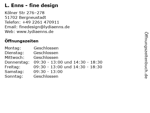 | Öffnungszeiten L. Enns - fine design in Bergneustadt anzeigen | |