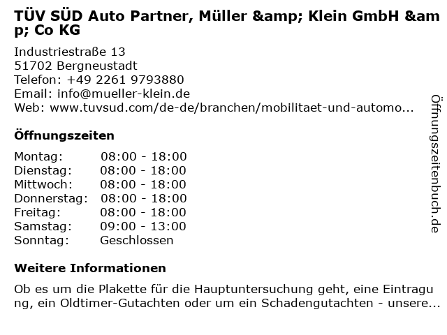 Branchen & Suchbegriffe zu TÜV SÜD Auto Partner, Müller & Klein GmbH & Co KG:abgasuntersuchung, auto, co, hauptuntersuchung, kfz, klein, müller, oldtimergutachten, partner, süd, tüv |
