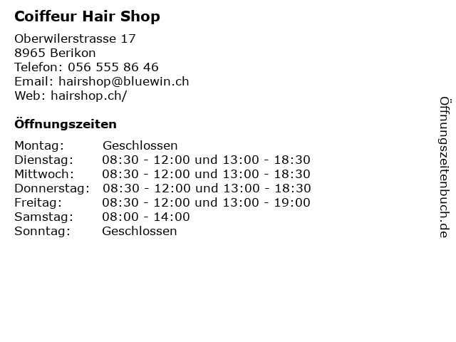 | Öffnungszeiten Coiffeur Hair Shop in Berikon anzeigen | |