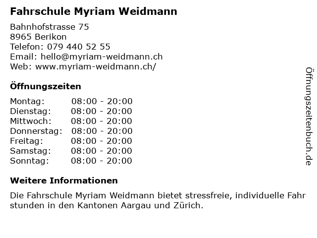 | Öffnungszeiten Fahrschule Myriam Weidmann in Berikon anzeigen | |