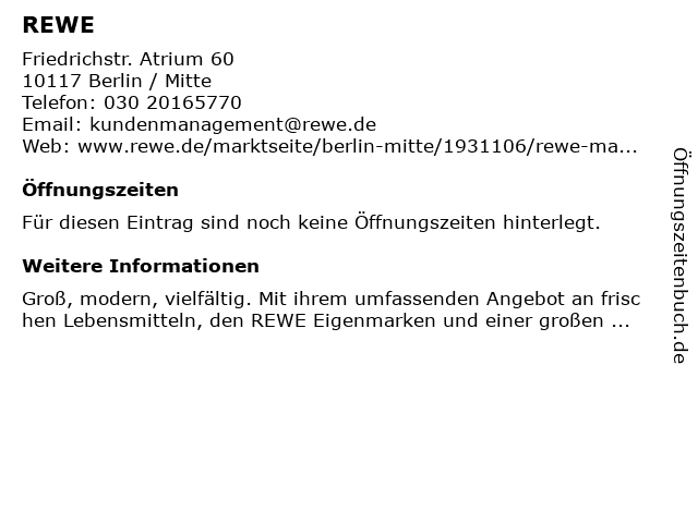 Hinweis: Groß, modern, vielfältig. Mit ihrem umfassenden Angebot an frischen Lebensmitteln, den REWE Eigenmarken und einer großen Getränkeauswahl, bieten REWE Supermärkte alles was Sie brauchen an einem Ort.
