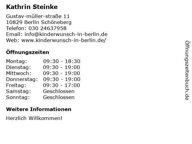 | Öffnungszeiten Kathrin Steinke in Berlin Schöneberg anzeigen | |