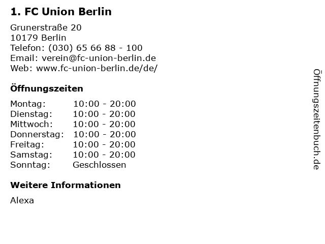 | Öffnungszeiten 1. FC Union Berlin in Berlin anzeigen | |