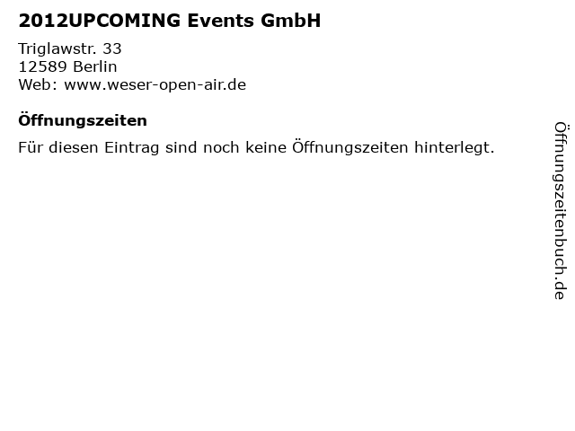 | Öffnungszeiten 2012UPCOMING Events GmbH in Berlin anzeigen | |