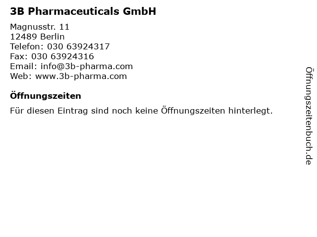| Öffnungszeiten 3B Pharmaceuticals GmbH in Berlin anzeigen | |