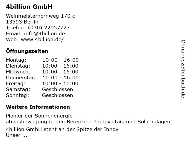 | Öffnungszeiten 4billion GmbH in Berlin anzeigen | |