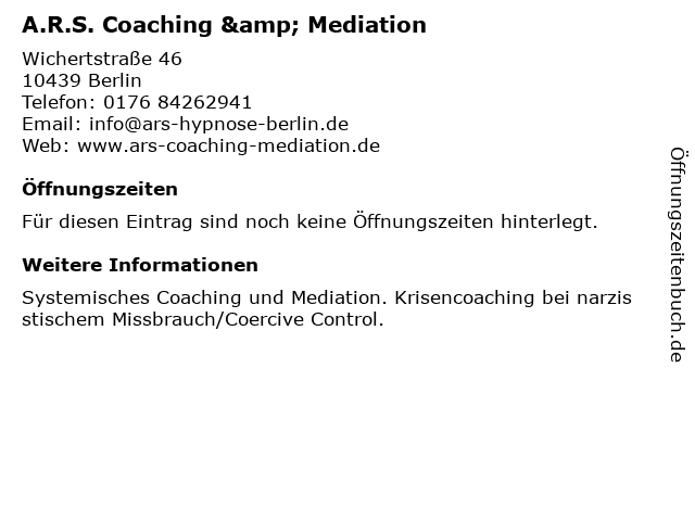 | Öffnungszeiten A.R.S. Coaching & Mediation in Berlin anzeigen | |