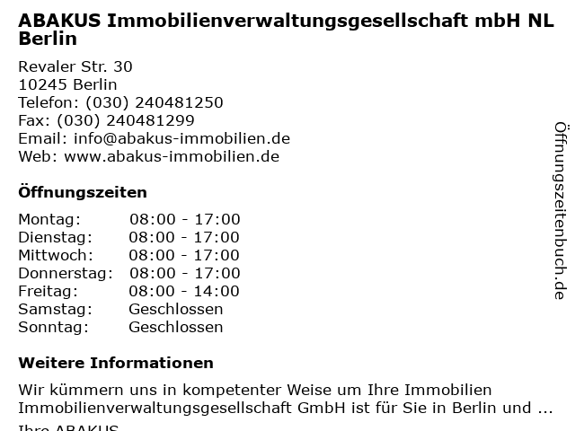 Branchen & Suchbegriffe zu ABAKUS Immobilienverwaltungsgesellschaft mbH NL Berlin:abakus, gewerbeverwaltung, immobilienmanagement, immobilienverwaltungsgesellschaft, mbh, mietverwaltung, nl, weg-verwaltung |