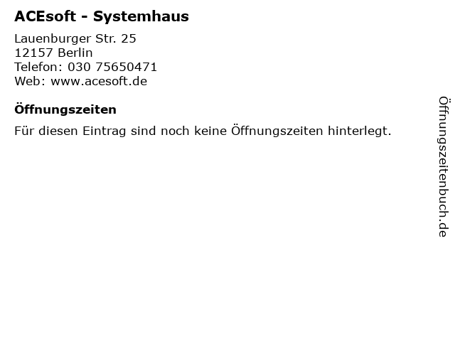 | Öffnungszeiten ACEsoft - Systemhaus in Berlin anzeigen | |