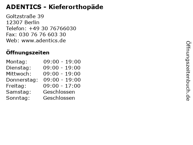 | Öffnungszeiten ADENTICS - Kieferorthopäde in Berlin anzeigen | |