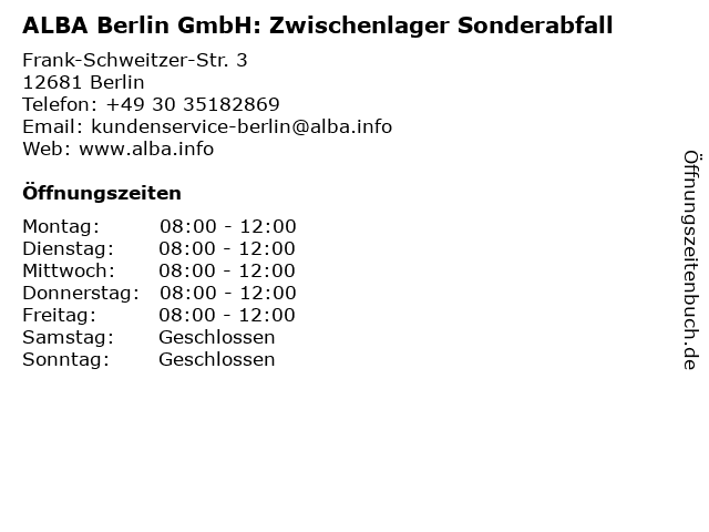 Branchen & Suchbegriffe zu ALBA Berlin GmbH: Zwischenlager Sonderabfall:abfallentsorgung, abfallverwertung, alba, sammelzentrum, sonderabfall, umweltdienst, zwischenlager |