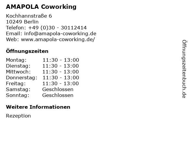 | Öffnungszeiten AMAPOLA Coworking in Berlin anzeigen | |