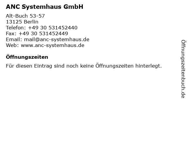 | Öffnungszeiten ANC Systemhaus GmbH in Berlin anzeigen | |