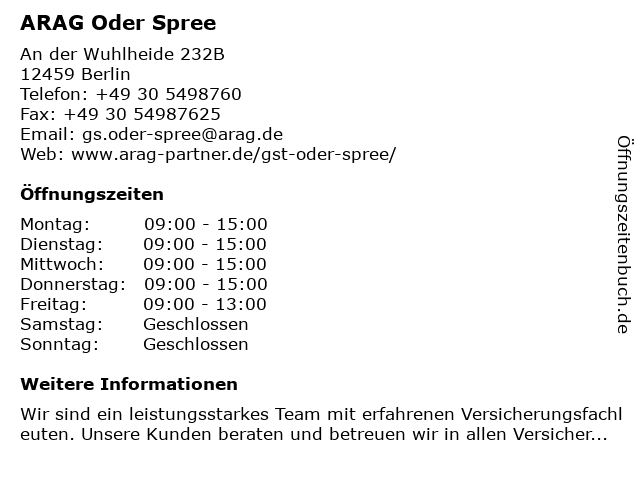 | Öffnungszeiten ARAG Oder Spree in Berlin anzeigen | |