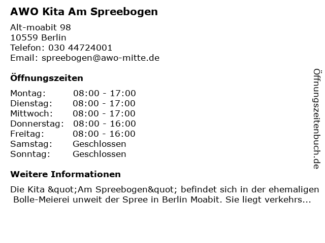 | Öffnungszeiten AWO Kita Am Spreebogen in Berlin anzeigen | |