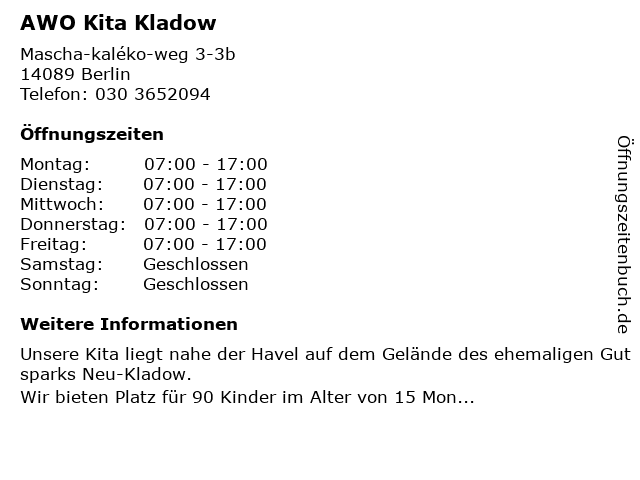 | Öffnungszeiten AWO Kita Kladow in Berlin anzeigen | |