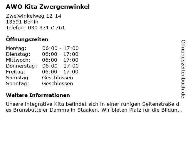 | Öffnungszeiten AWO Kita Zwergenwinkel in Berlin anzeigen | |