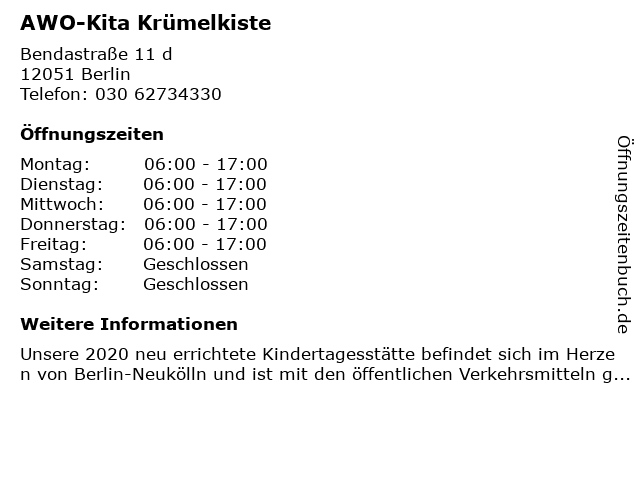 | Öffnungszeiten AWO-Kita Krümelkiste in Berlin anzeigen | |