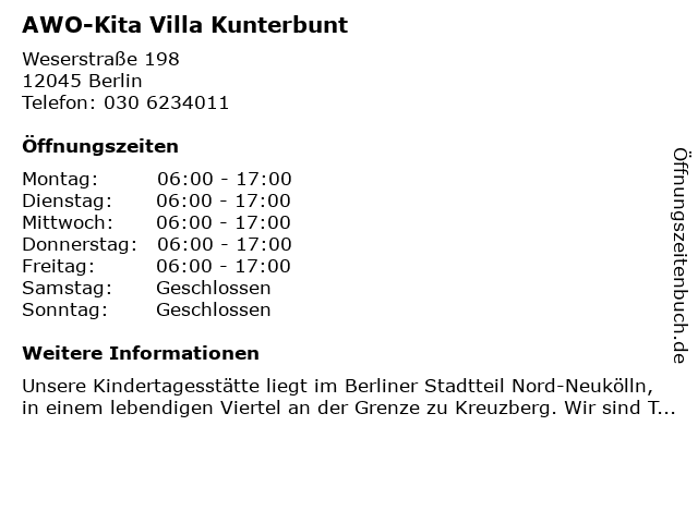 | Öffnungszeiten AWO-Kita Villa Kunterbunt in Berlin anzeigen | |