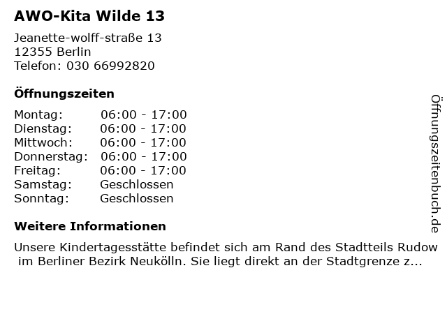 | Öffnungszeiten AWO-Kita Wilde 13 in Berlin anzeigen | |