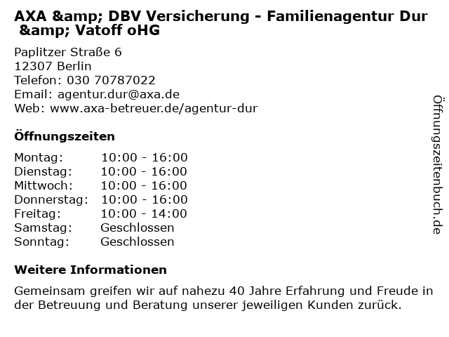 3 AXA Schott & Kaminski oHG Filiale Berlin Schönefeld (Entfernung: 6,93 km) Mittelstraße b0.27, 12529 Berlin 5 AXA-Generalvertretung Frank Schubert Versicherungen und Geldanlagen (Entfernung: 11,49 km) Wexstr. 19, 10715 Berlin 6 |
