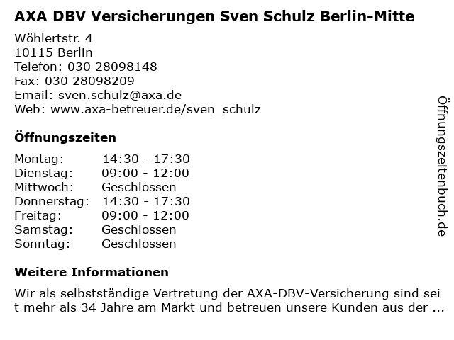 1 AXA Versicherung AG Hauptvertretung Berlin Tino Schönberger (Entfernung: 0,01 km) Wöhlertstraße 4, 10115 Berlin 3 DBV Deutsche Beamtenversicherung Nicola Born in Berlin (Entfernung: 0,01 km) Wöhlertstraße 4, 10115 Berlin 4 Neue Chance gGmbH Sozial- und Jugendhilfedienste Mitte (Entfernung: 0,34 km) Chausseestr. 84, 10115 Berlin 6 |