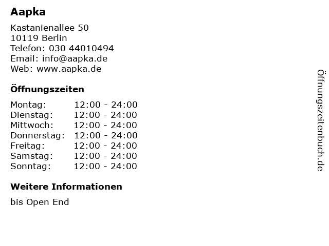 | Öffnungszeiten Aapka in Berlin anzeigen | |