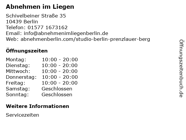 | Öffnungszeiten Abnehmen im Liegen in Berlin anzeigen | |