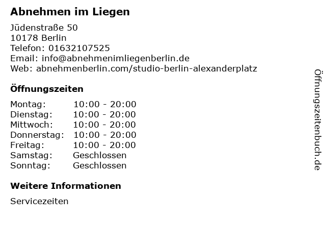 | Öffnungszeiten Abnehmen im Liegen in Berlin anzeigen | |