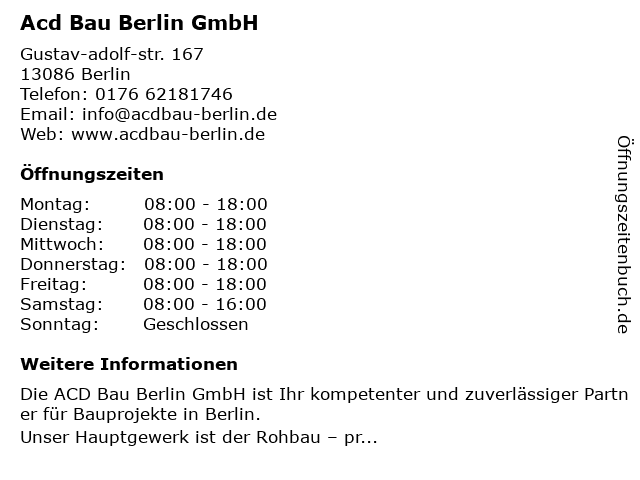 | Öffnungszeiten Acd Bau Berlin GmbH in Berlin anzeigen | |