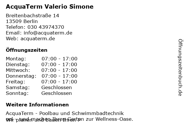 | Öffnungszeiten AcquaTerm Valerio Simone in Berlin anzeigen | |