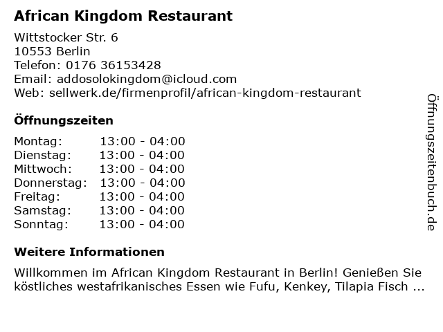 | Öffnungszeiten African Kingdom Restaurant in Berlin anzeigen | |