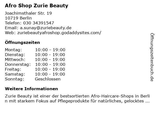 | Öffnungszeiten Afro Shop Zurie Beauty in Berlin anzeigen | |