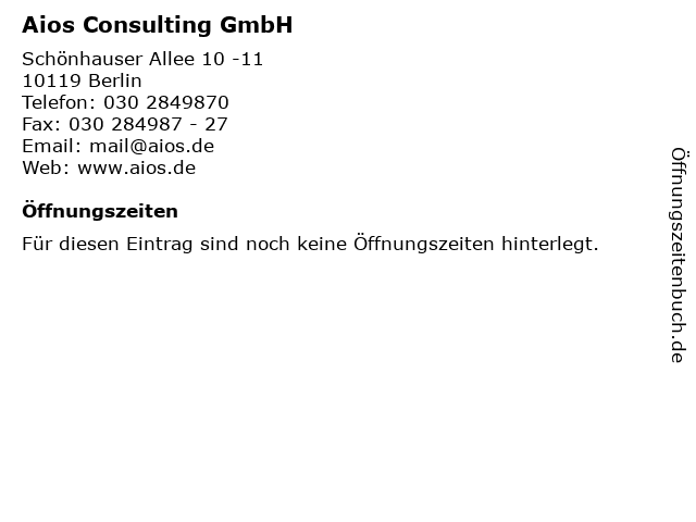 | Öffnungszeiten Aios Consulting GmbH in Berlin anzeigen | |