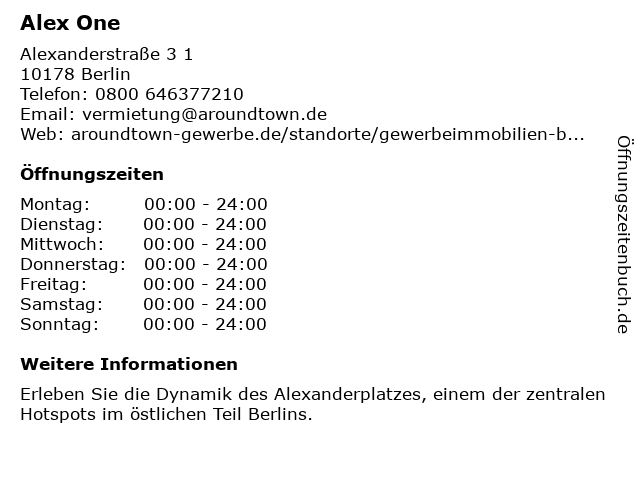 | Öffnungszeiten Alex One in Berlin anzeigen | |