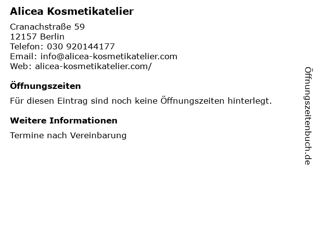 | Öffnungszeiten Alicea Kosmetikatelier in Berlin anzeigen | |