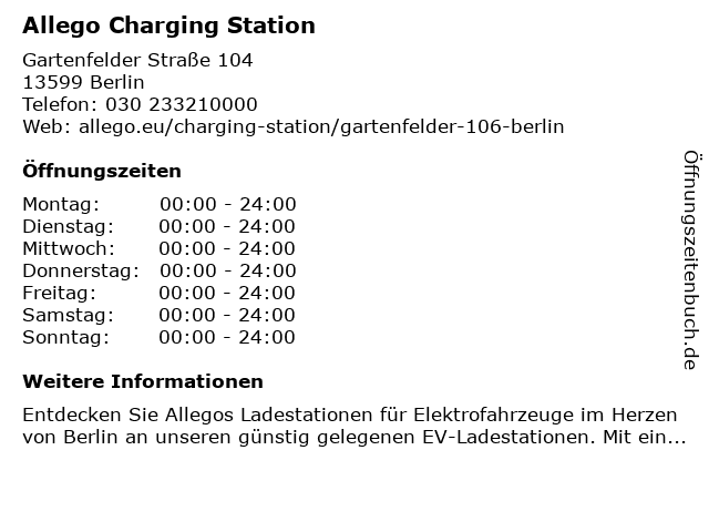 | Öffnungszeiten Allego Charging Station in Berlin anzeigen | |