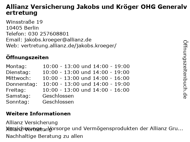 1 Allianz Versicherung Jana Wintz Generalvertretung (Entfernung: 1,08 km) Danziger Straße 179, 10407 Berlin 2 Allianz Versicherung Simone Hiller Generalvertretung (Entfernung: 1,39 km) Wichertstraße 36, 10439 Berlin 6 Allianz Versicherung Büsch OHG Generalvertretung (Entfernung: 1,95 km) Brunnenstraße 149-150, 10115 Berlin |