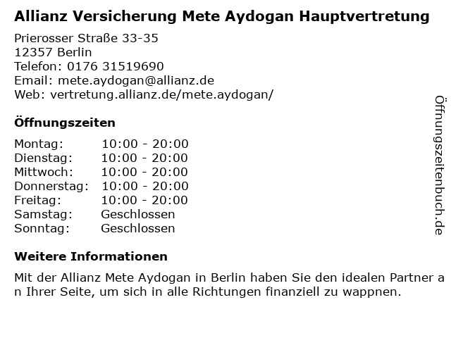 6 Mager Elke Hauptvertretung der Allianz Versicherungs-AG (Entfernung: 12,28 km) Birkbuschstr. 12, 12167 Berlin |