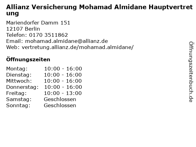 1 Allianz Versicherung Anil Erdogan Hauptvertretung (Entfernung: 0,00 km) Mariendorfer Damm 151, 12107 Berlin 3 Allianz Versicherung Muhammad Ridani Hauptvertretung (Entfernung: 1,20 km) Mariendorfer Damm 45, 12109 Berlin 4 Allianz Versicherung Ugur Arslan Hauptvertretung (Entfernung: 5,63 km) Schenkendorfstraße 4, 10965 Berlin 5 Allianz Versicherung Sebastian Wolf Hauptvertretung (Entfernung: 8,15 km) Kronenstraße 63, 10117 Berlin 6 DEVK Versicherungen: Mohamad Iyad Almidane (Berater*in ausgeschieden) (Entfernung: 8,15 km) Berliner Str. 29, 14169 Berlin |