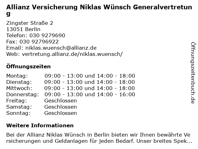 2 Allianz Versicherung Kevin Hiller Generalvertretung (Entfernung: 1,79 km) Konrad-wolf-straße 1, 13055 Berlin 3 Mecklenburgische Versicherungsgruppe - Bezirks-Generalvertretung Holger Klose (Entfernung: 4,00 km) Max-Steinke-Straße 3-4, 13086 Berlin 4 Allianz Versicherung Stefan Teetz Generalvertretung (Entfernung: 6,06 km) Rosenfelder Straße 17, 10315 Berlin 5 Allianz Versicherung Mlynek und Teetz OHG Generalvertretung (Entfernung: 6,06 km) Rosenfelder Straße 17, 10315 Berlin 6 |