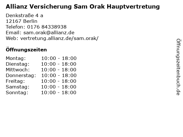 2 Allianz Versicherung Muhammad Ridani Hauptvertretung (Entfernung: 2,34 km) Mariendorfer Damm 45, 12109 Berlin 5 AXA Versicherung - Hauptvertretung Renate Nikolay (Entfernung: 3,57 km) Hauptstraße 108, 10827 Berlin 6 Allianz Versicherung Martin Peeck Hauptvertretung (Entfernung: 3,68 km) Wasunger Weg 51, 12249 Berlin |