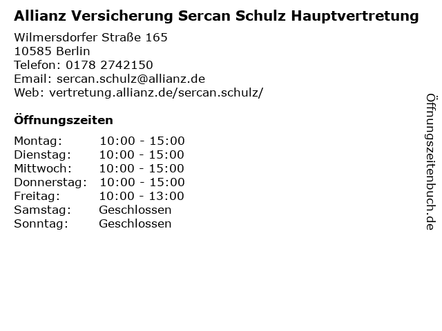1 Allianz Versicherung Duran Sahin Hauptvertretung (Entfernung: 0,00 km) Wilmersdorfer Straße 165, 10585 Berlin 2 Allianz Versicherung Hasan Ilter Hauptvertretung (Entfernung: 0,00 km) Wilmersdorfer Straße 165, 10585 Berlin 4 5 Günter Schulz Mecklenburgische Versicherung (Entfernung: 0,31 km) Kaiser-Friedrich-Str. 104, 10585 Berlin 6 |