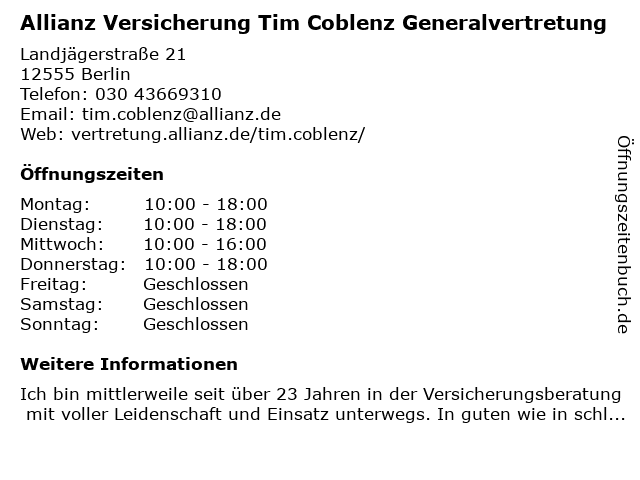 1 Allianz Versicherung Alexander Hennig Generalvertretung (Entfernung: 0,46 km) Freiheit 3, 12555 Berlin 2 Allianz Versicherung Alexander Hennig Generalvertretung (Entfernung: 0,46 km) Freiheit 3, 12555 Berlin 6 Allianz Versicherung Dirk Wagner Generalvertretung (Entfernung: 2,88 km) Regattastraße 112 a, 12527 Berlin |